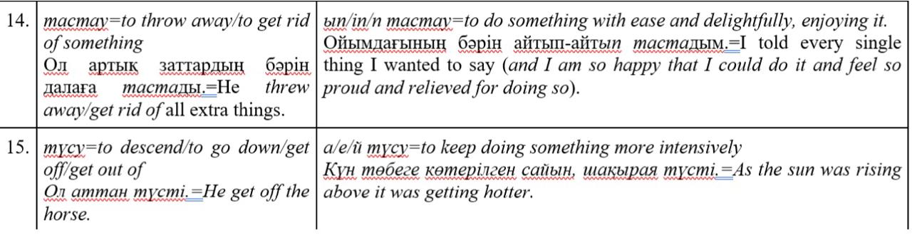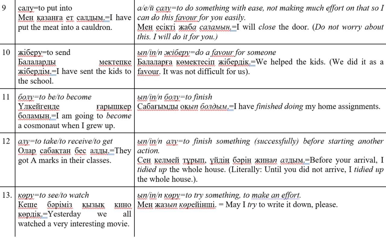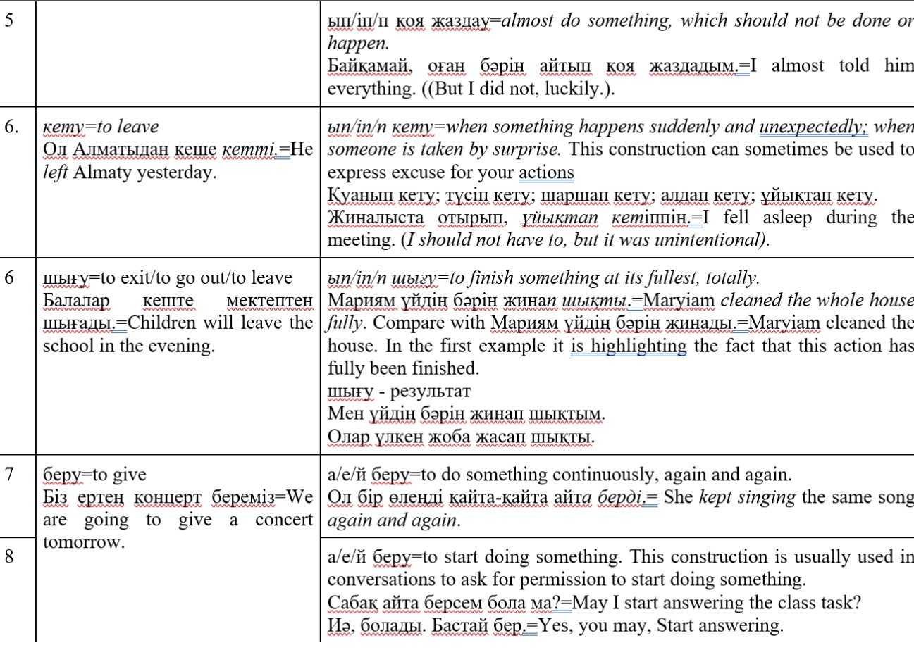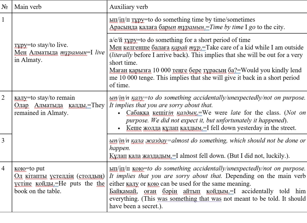 In Kazakh language sometimes some contextual information about the situation might be expressed with the help of auxiliary verbs. These verbs can function either as individual full verbs with its own meaning or they may go in pairs with the main verb to give additional information to the situation. For instance the verb беру may function as to give as the main verb, but as an auxiliary verb in pair with another verb it means to start doing something.
