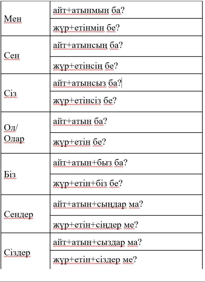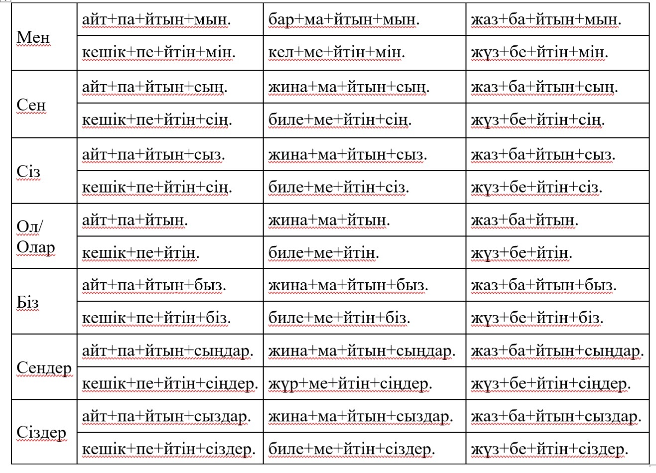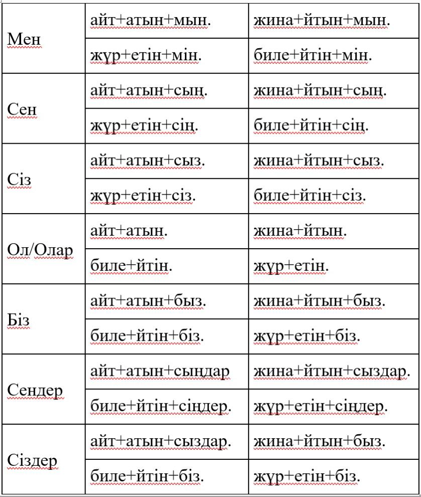 Ол бұрын өлең жаз+атын. Мен осы мектепке бар+атын+мын. Сен бізге жиі кел+етін+сің.